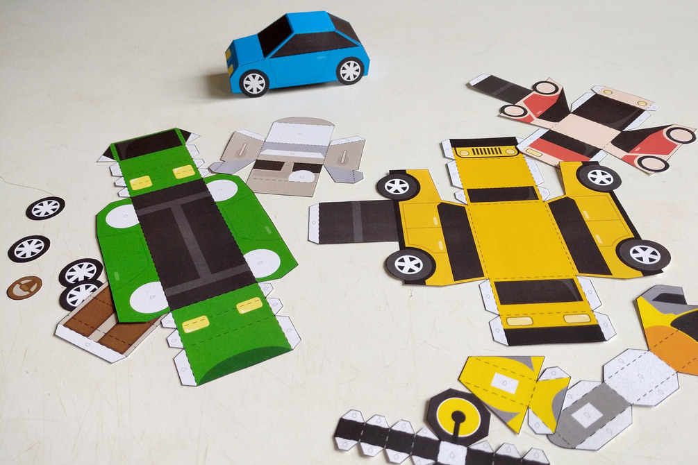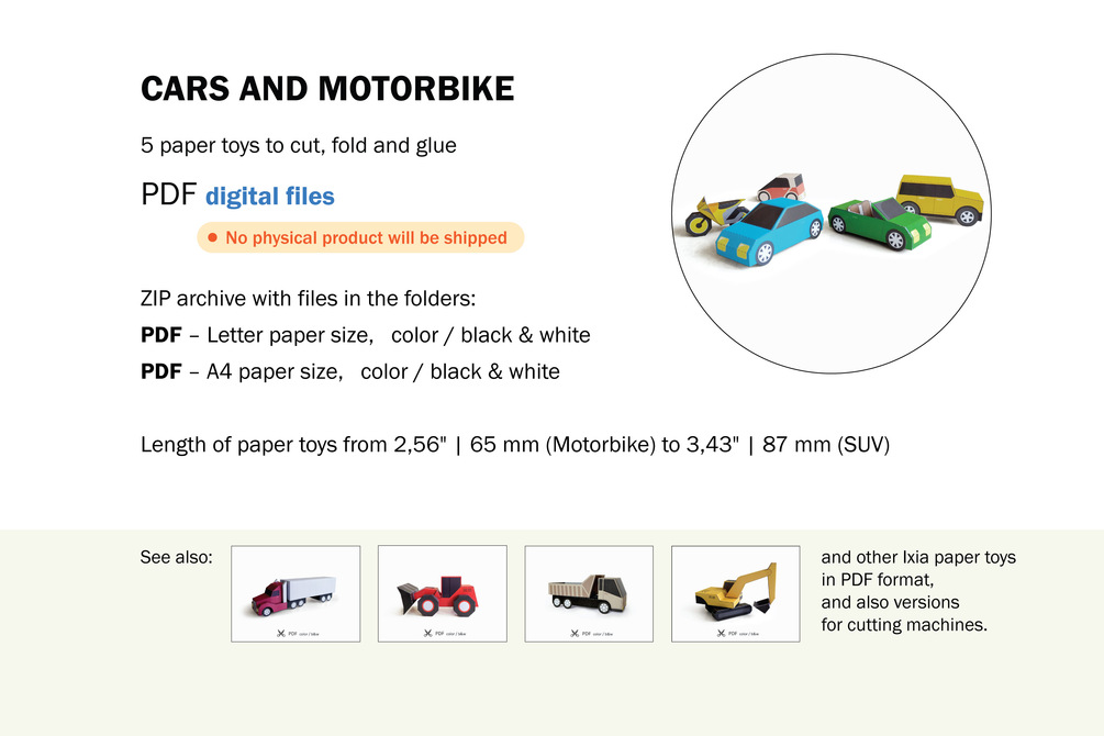 Length of paper toys from 2,56" | 65 mm (Motorbike) to 3,43" | 87 mm (SUV)